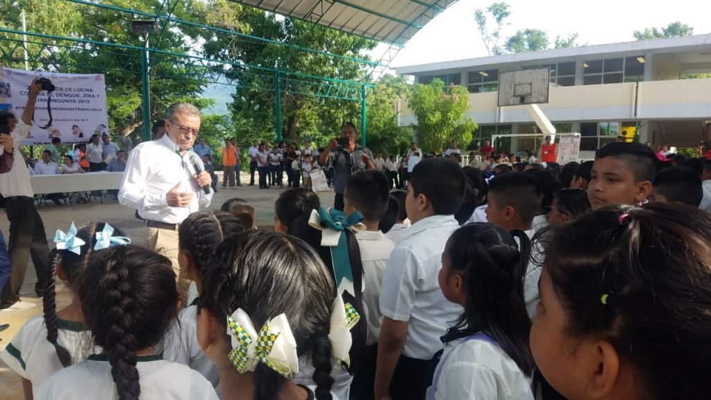 El secretario de Salud estatal Carlos de la Peña Pintos inauguró en Atoyac de Álvarez la 2ª Jornada de Lucha contra el Dengue, Zika y Chikungunya 2019 bajo el lema “Y tú, ¿qué haces contra el dengue?”, donde destacó la importancia de sumar a alumnos, padres de familia y maestros a las acciones para mantener limpios hogares y sitios públicos y evitar la proliferación del mosco aedes aegypti, transmisor de estas enfermedades.