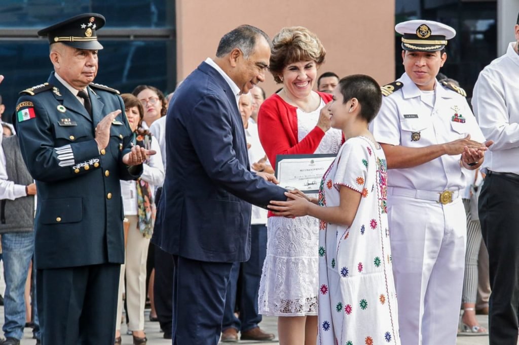 En este acto cívico militar, acompañado de su esposa, la presidenta del DIF Guerrero, Mercedes Calvo, el gobernador entregó reconocimientos a Elvira García, por obtener el primer lugar en el Campeonato Nacional Juvenil de Oratoria y a Maximiliano Palacios por su primer lugar en la Olimpiada del Conocimiento Infantil en el estado.
