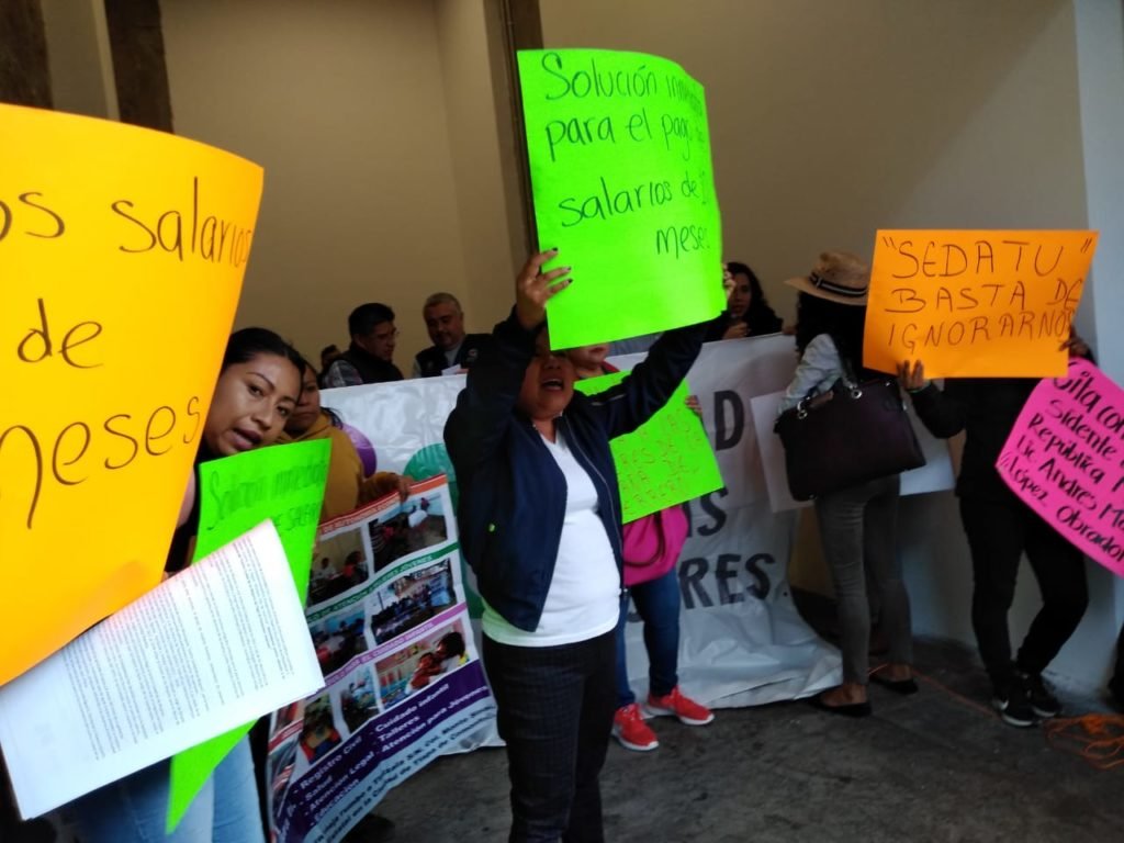 Trabajadores de Centro Ciudad Mujeres de Tlapa protestaron en las oficinas centrales de la Secretaría de Desarrollo Agrario Territorial y Urbano (Sedatu), en la Ciudad de México, para exigir que las atiendan y les paguen los diez meses de salario que les adeudan, además que les resuelvan su situación laboral.