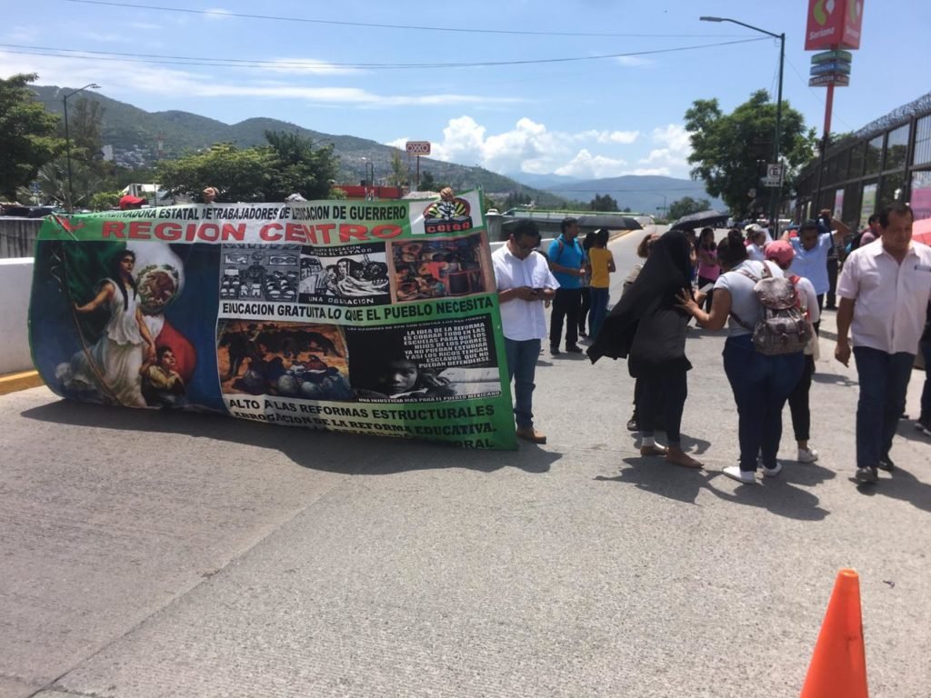 Integrantes de la Coordinadora Estatal de los Trabajadores de la Educación en Guerrero (CETEG) de la zona Centro, bloquearon algunos minutos el bulevar René Juárez Cisneros frente a palacio de gobierno para exigir la entrega de 40 nombramientos de base para maestros que cubren interinatos.