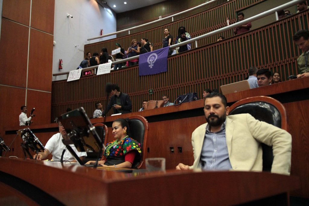 Encabezados por la activista, Yoloczin Jaimes, un grupo de mujeres con pañuelos violeta, exigieron además una disculpa pública del diputado de Morena, Moisés Reyes Sandoval por el plagio de una iniciativa ya presentada por ellas.