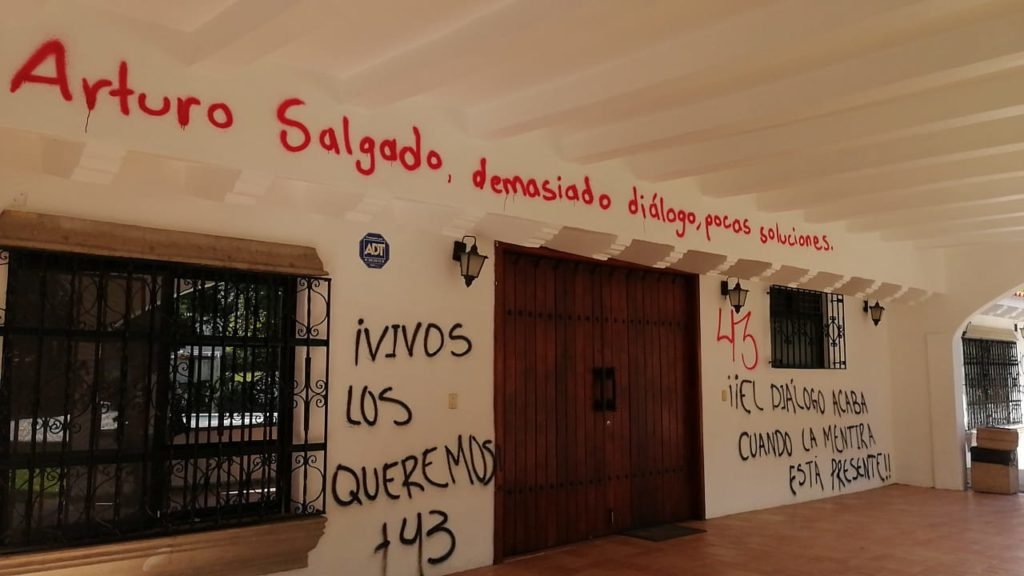 Los normalistas se bajaron y se introdujeron a las oficinas alternas, y con spray pintaron la fachada del edificio mientras exigían una audiencia con Salgado Urióstegui, porque a pesar que las autoridades presumen una inversión de 50 millones de pesos en esa institución, los trabajos en los dormitorios, de la cancha de fútbol y del gimnasio están inconclusos.