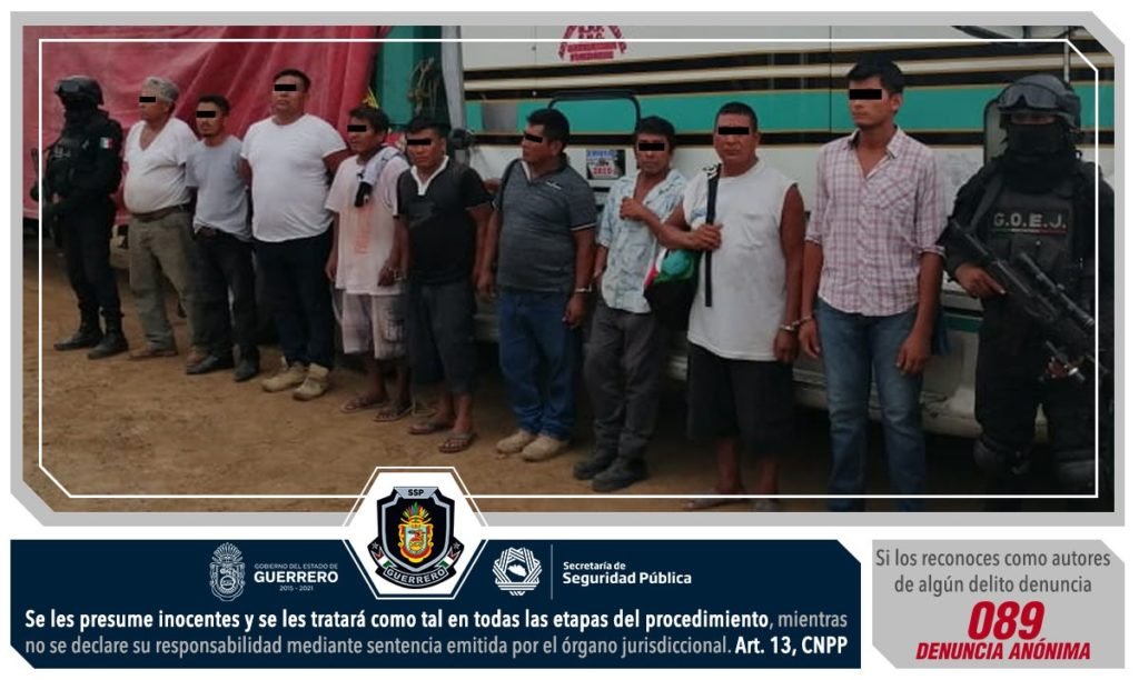 Elementos de la Policía Estatal y del Grupo de Operaciones Especiales “Jaguar” capturaron a nueve hombres cuando saqueaban una bodega de fertilizante en el municipio de Petatlán.