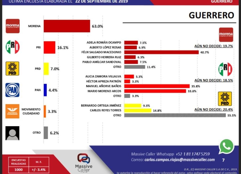 Para levantar la encuesta, Massive Caller entrevistó por teléfono a mil guerrerenses, a quienes preguntó por qué partido votarían y quién debería abanderar la candidatura a gobernador en cada instituto político.