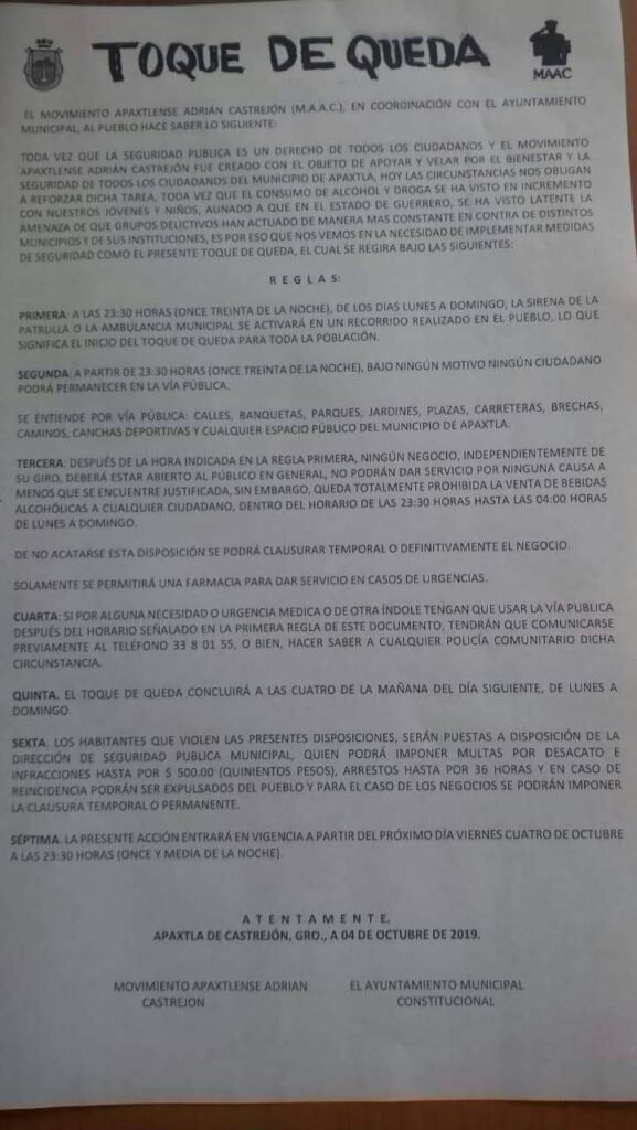 El Movimiento Apaxtlense Adrián Castrejón (MAAC) y el ayuntamiento emitieron un comunicado en el que anunciaron el toque de queda y expusieron las reglas bajo las que operará esta medida.
