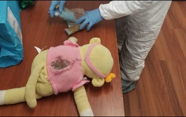 En un comunicado, detalló que al abrir una caja de cartón hallada por el perro entrenado en detección de narcóticos, se encontró un peluche en forma de chango que escondía un saco de tela con pastillas de color azul con las características de la droga.