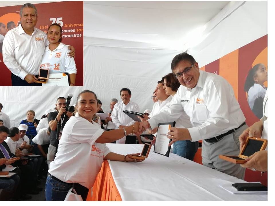 Durante la conmemoración por el 75 aniversario de la fundación del SNTE, el Secretario General Alfonso Cepeda Salas, acompañado del Secretario General de la Sección 14 de Guerrero, Javier San Martín Jaramillo, entregó reconocimientos a docentes destacados del país, entre ellos, la maestra Jennifer Jaramillo Aguilar, de la región Acapulco, por su mérito académico.