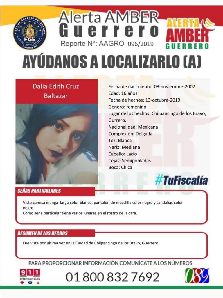 El día de ayer la Alerta Amber fue activada por la desaparición de Dalia Edith Cruz Baltazar, de 15 años de edad, originaria de Chilpancingo quien fue vista la última vez el pasado 13 de octubre de este año.