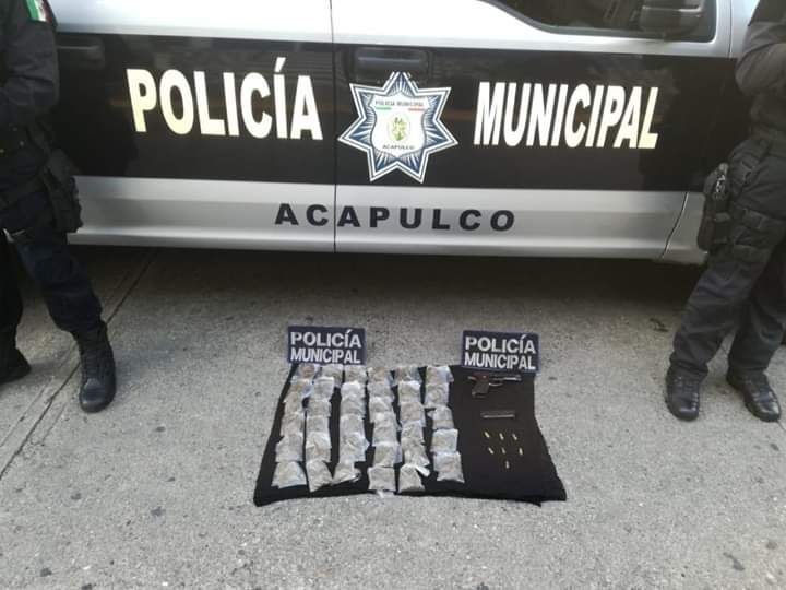 ACAPULCO. —Elementos de la Policía Municipal aseguraron un arma de fuego y 35 bolsas de plástico con marihuana, en la avenida Inalámbrica del barrio La Pinzona.