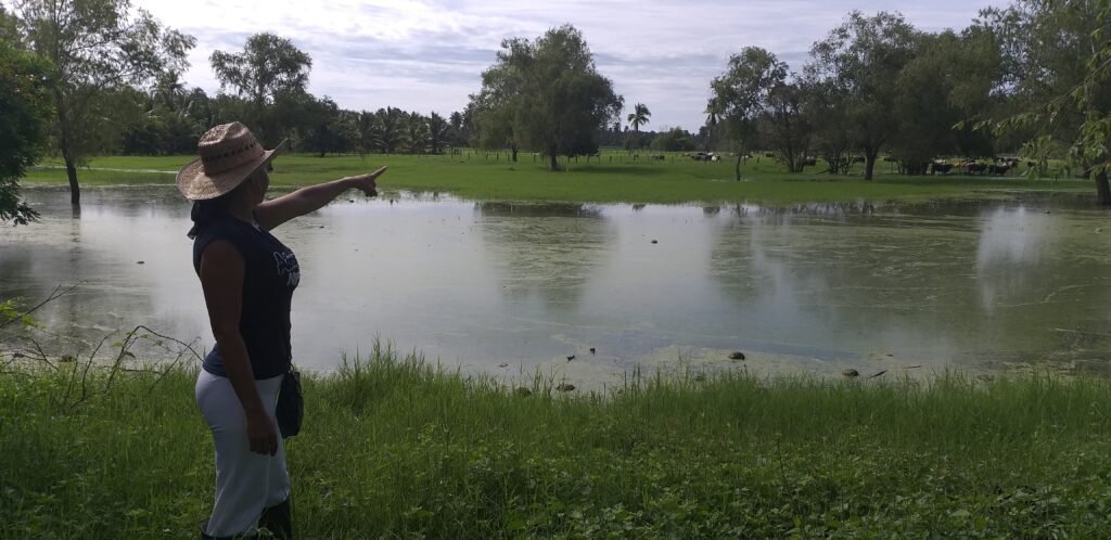 Durante un recorrido por la zona, se pudo ver que el agua anega un terreno extenso, en el cual hay pastizales de donde se alimenta el ganado y varias hectáreas sembradas con palmeras, en las que el agua alcanza un metro de altura.