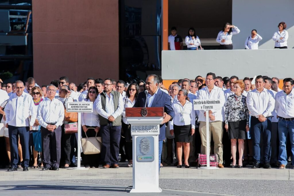 En la explanada Vicente Guerrero de Palacio de Gobierno, acompañado de su esposa, la presidenta del DIF Guerrero, Mercedes Calvo y de los representantes de los Poderes Legislativo y Judicial, el Ejecutivo estatal reconoció que en Guerrero no se viven cosas extraordinarias de las que se viven en el país, pues son las mismas circunstancias.