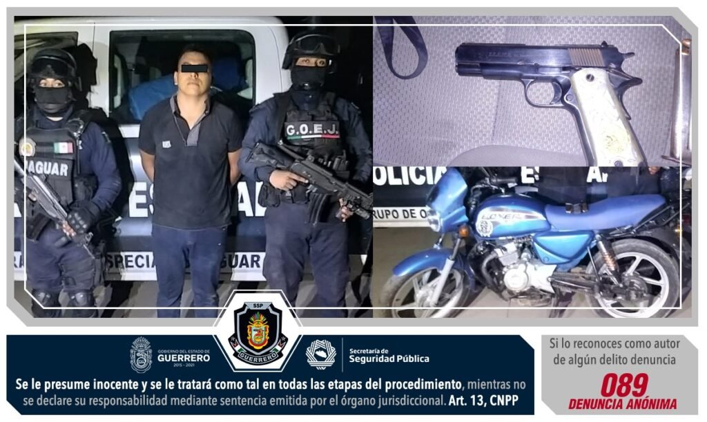 Elementos del Grupo de Operaciones Especiales “Jaguar” y de la Policía Estatal capturaron a un sujeto que portaba un arma de fuego, cargadores y cartuchos útiles de uso exclusivo del Ejército, Armada y Fuerza Aérea, así como una motocicleta con reporte de robo, en la carretera federal, en Zihuatanejo.