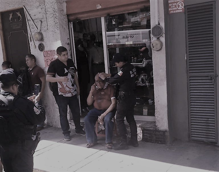Elementos de la Policía Municipal llegaron y vieron a un señor como de 70 años de edad, el cual presentaba una herida considerable en la parte frontal del cráneo, de donde salía sangre en abundancia, parte de la cual le había manchado su playera roja y su rostro.