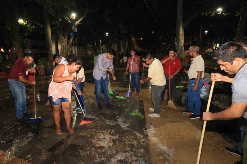 Acapulco- Con la finalidad de ofrecer una buena imagen del Zócalo de la ciudad, personal de áreas operativas del Ayuntamiento, de manera conjunta con vendedores, realizaron labores de limpieza y lavado del lugar.