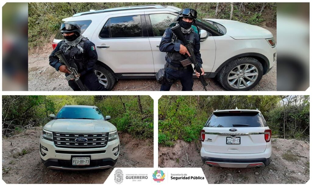 Elementos de la Policía Estatal recuperaron en Eduardo Neri un vehículo con reporte de robo que presenta las siguientes características: marca Ford, tipo Explorer, modelo 2017 y placas de circulación PZJ8973 del estado de Morelos.