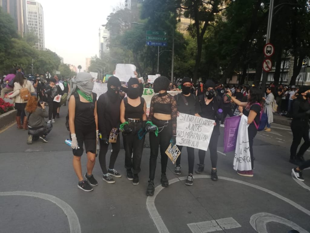 La marcha es resguardada por ciudadanas del llamado “Cinturón de paz” y también por mujeres policías, que buscan resguardar los monumentos y las estatuas que están sobre Paseo de la Reforma; sin embargo, algunos grupos de mujeres encapuchadas lograron romper los cercos y hacer algunas pintas.