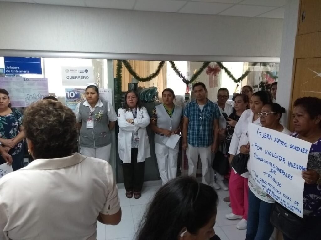 ACAPULCO.— Trabajadores del Hospital General del Instituto de Seguridad y Servicios Sociales de los Trabajadores del Estado (ISSSTE), realizaron este miércoles una protesta para exigir la destitución del coordinador de Recursos Humanos, Agripino González Callejas, a quien acusan de acoso laboral.