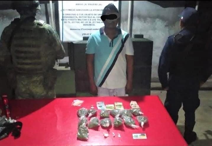 ACAPULCO. — Elementos de la Policía Municipal en coordinación con efectivos de la Secretaría de la Defensa Nacional capturaron a un sujeto que portaba droga, en el Kilómetro 22 de la carretera federal.