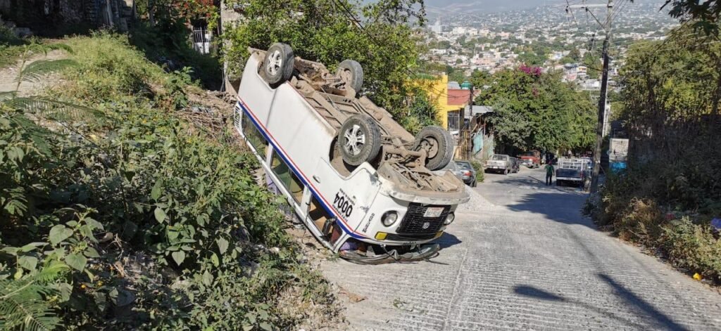 Una combi del servicio público volcó sobre la calle Emiliano Zapata de la colonia 24 de Febrero, en la ciudad de Iguala.