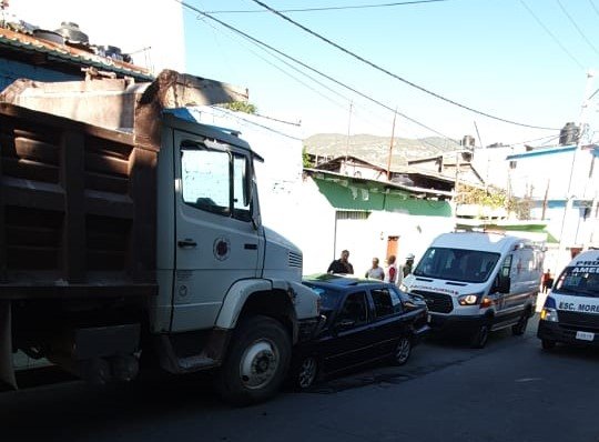 Resulta que el camión de volteo, color blanco, con placas de circulación 1 JAL-239 de Guerrero, que estaba estacionado en esa calle, se le votaron los frenos, se fue cuesta abajo y se impactó contra un auto de la marca Volkswagen, tipo Jetta, en color negro, modelo atrasado, el cual subía la cuesta.