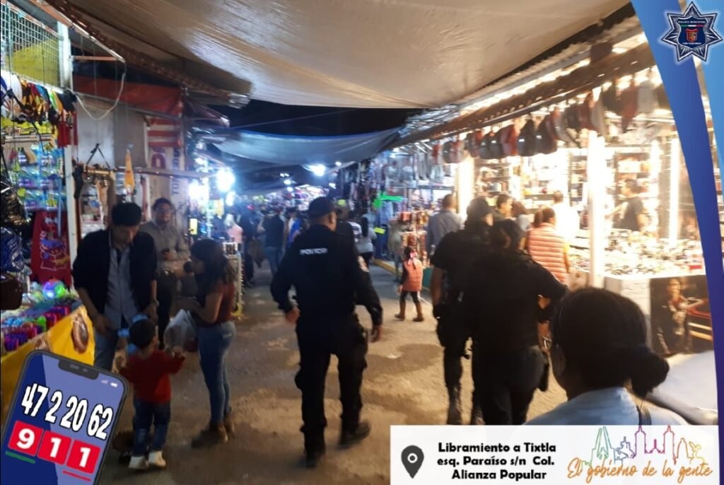 Elementos de la Secretaría de Seguridad Pública Municipal mantienen de manera permanente recorridos preventivos y de disuasión de ilícitos en las instalaciones e inmediaciones de la feria de San Mateo, Navidad y Año Nuevo, con el objetivo de inhibir actos que puedan poner en riesgo la integridad de los visitantes y de transeúntes de este lugar.