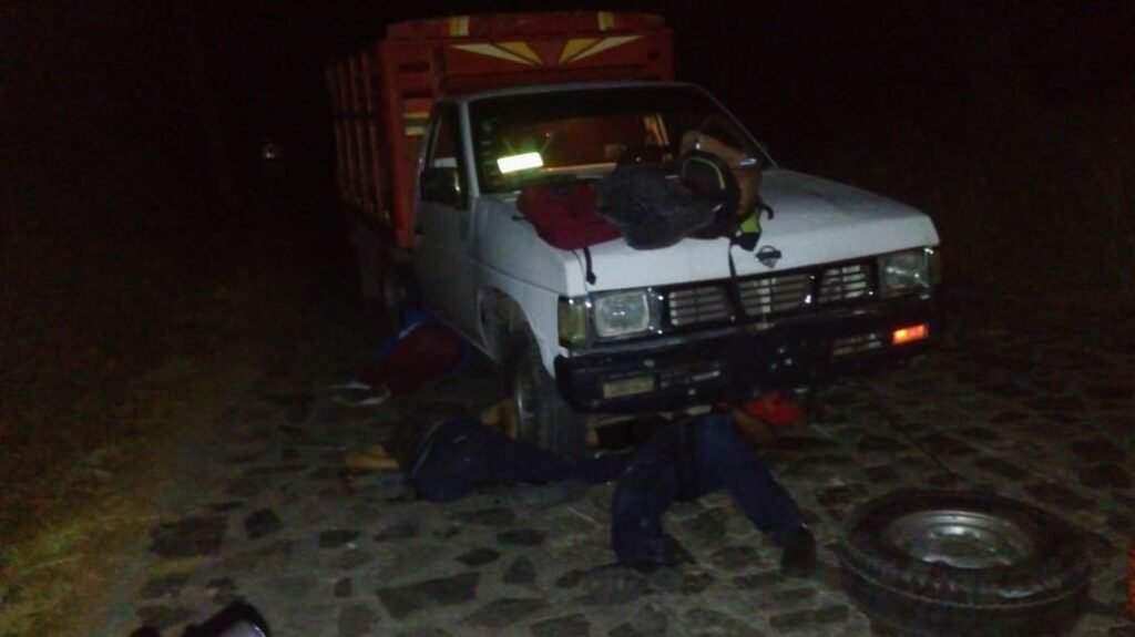 Al llegar se encontraron con los cuerpos de tres personas a un lado de una camioneta de redilas de la marca Nissan, quienes cambiaban una llanta ponchada cuando fueron sorprendidos por un grupo de civiles armados que los masacró a balazos.