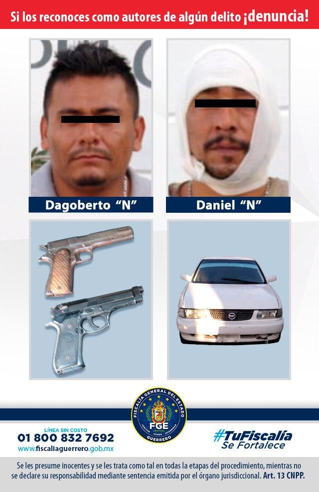 ACAPULCO. — Elementos de la Fiscalía General del Estado detuvieron en flagrancia a Dagoberto “N” y Daniel “N”, quienes agredieron con armas de fuego a Policías Ministeriales y Estatales en la colonia Simón Bolívar.
