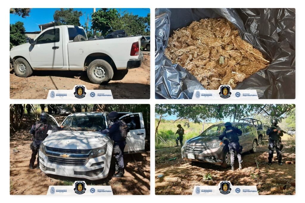 Elementos de la Policía Estatal, del Grupo de Operaciones Especiales “Jaguar” y de la Guardia Nacional aseguraron tres vehículos, autopartes, equipo táctico y droga, en el tramo carretero La Unión-Troncones, municipio de La Unión de Isidoro Montes de Oca, así como en algunas de sus localidades.