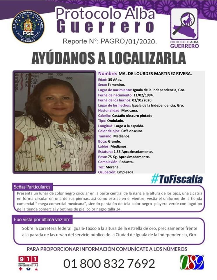 La Fiscalía General del Estado (FGE) solicitó el apoyo de la población para localizar a María de Lourdes Martínez Rivera quien desapareció en Iguala de la Independencia desde el pasado 3 de enero.