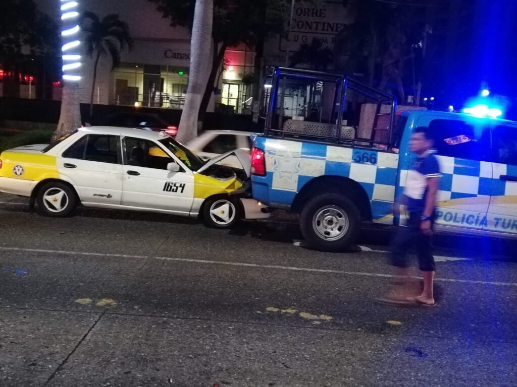 Daños materiales, al menos tres lesionados leves, fue el saldo de un choque entre un auto del Servicio Público (taxi) y una camioneta de la Policía Turística, en plena costera Miguel Alemán muy cerca del Zócalo del puerto de Acapulco.