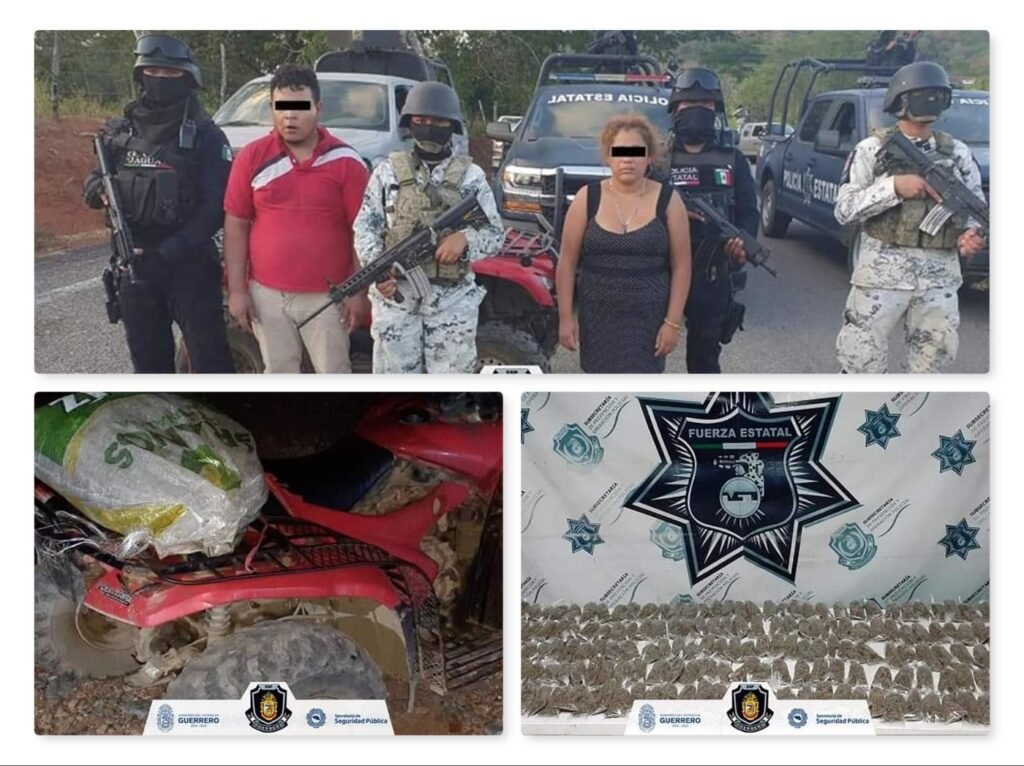 . Elementos de la Policía Estatal, del Grupo de Operaciones Especiales “Jaguar”, y de la Guardia Nacional detuvieron a una fémina y un sujeto con droga y una cuatrimoto, en el municipio de La Unión de Isidoro Montes de Oca-