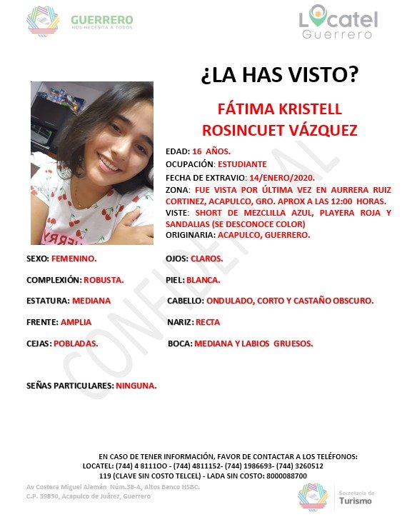 ACAPULCO. — Desde el pasado martes no se ha podido dar con el paradero de la joven Fátima Kristell Rosincuet Vázquez, de 16 años de edad.