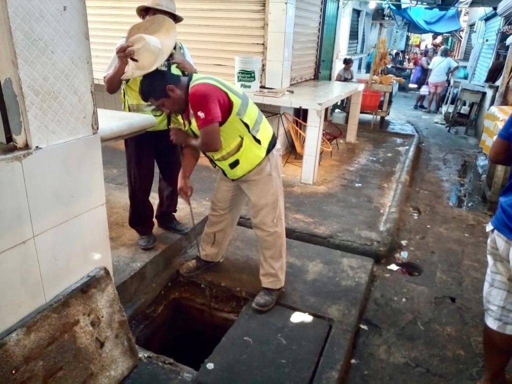 Las brigadas de la dependencia hicieron la poda de árboles y vegetación en el mercado de Caletilla, barrido fino y grueso, así como levantamiento de desechos; otra brigada se desplegó en la nave de ropa del mercado Central donde realizaron el desazolve y la colocación de dos tapas de concreto para registros.