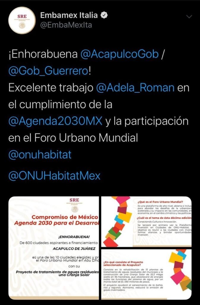 “¡Enhorabuena @AcapulcoGob/ @Gob_Guerrero! Excelente trabajo @Adela_Roman en el cumplimiento de la @Agenda2030MX y la participación en el Foro Urbano Mundial @onuhabitat @ONUHabitatMex”, reza el tweet.