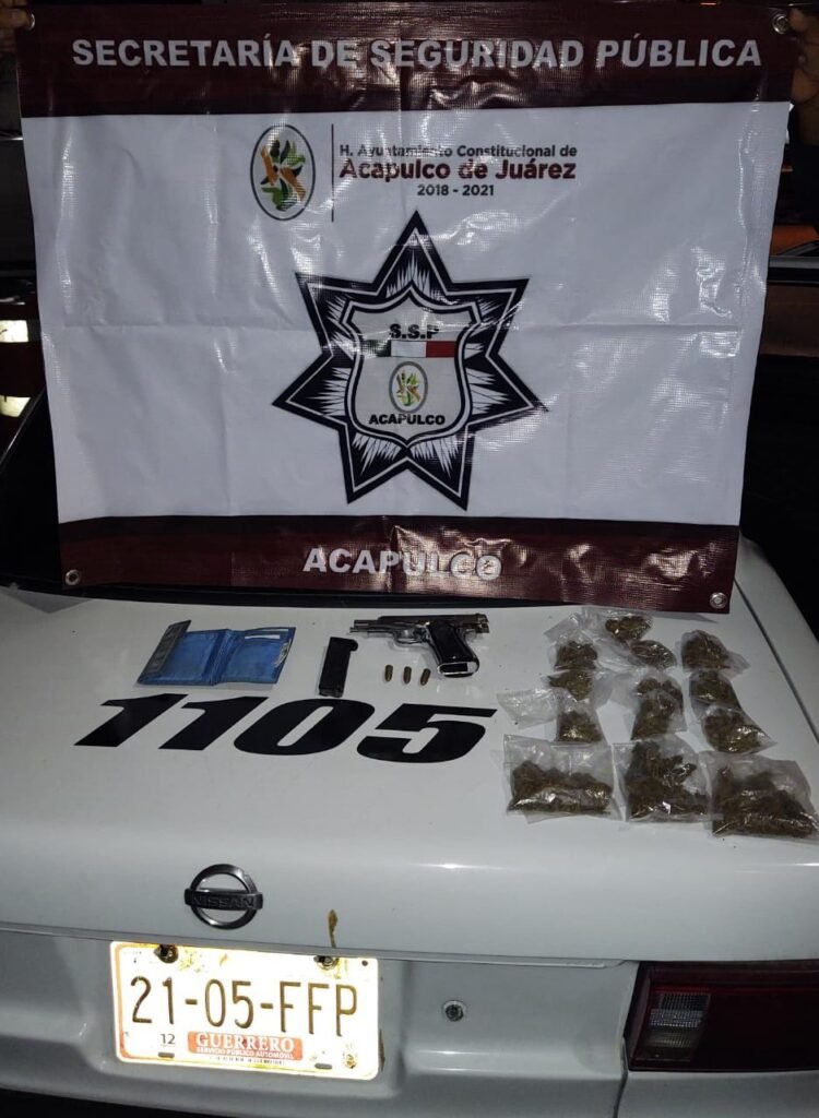 ACAPULCO. — Elementos de la Policía Municipal incautaron un vehículo del servicio público con droga y un arma de fuego, que tres sujetos abandonaron en sobre la Avenida Ruiz Cortines, en la unidad habitacional Módulo Social Fovissste “Vicente Guerrero”.