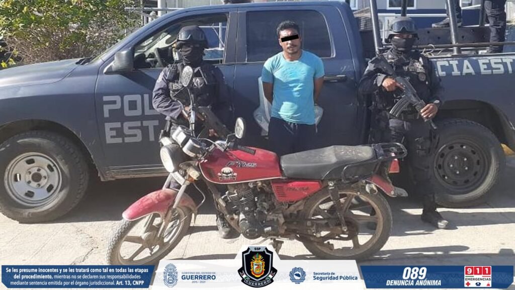 Personal de la Policía Estatal y del Grupo de Operaciones Especiales “Jaguar” detuvieron a un sujeto que conducía una motocicleta con reporte de robo, en la comunidad de Juluchuca, sobre una brecha de terracería que conduce a Rancho Nuevo, en el municipio de Petatlán.