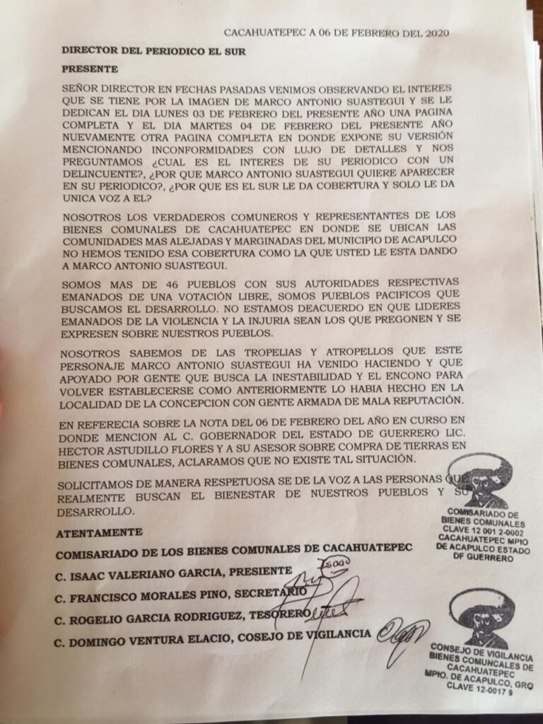 Isaac Valeriano García, Francisco Morales Pino, Rogelio García Rodríguez y Domingo Ventura Elacio, presidente, secretario, tesorero y responsable del Consejo de Vigilancia del Comisariado de los Bienes Comunales de Cacahuatepec, del municipio de Acapulco, acusan a Marco Antonio Suástegui de pretender establecerse nuevamente en la comunidad La Concepción apoyado por “gente armada” y “de mala reputación”.