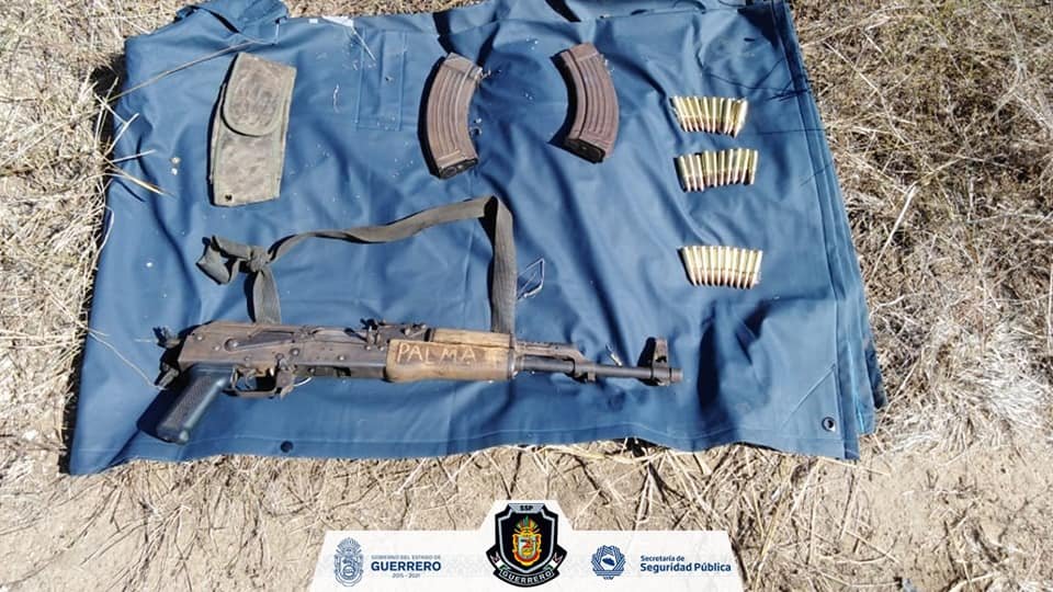 Elementos del Grupo de Operaciones Especiales “Jaguar” y de la Policía Estatal destacamentados en Costa Grande, en coordinación con personal del Ejército Mexicano, aseguraron en el municipio de Petatlán, un arma de fuego, cargadores y cartuchos útiles de uso exclusivo del Ejército.