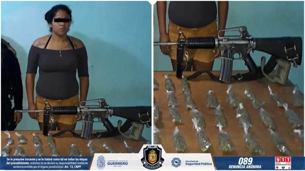 Dijo llamarse Janetcy “N” de 22 años de edad, quien portaba un arma de fuego larga tipo AR-15, calibre .223mm, con un cargador abastecido con 5 cartuchos del mismo calibre; asimismo, en el lugar fue asegurada una mochila que en su interior contenía 55 bolsitas de plástico con hierba verde con características propias de la marihuana.