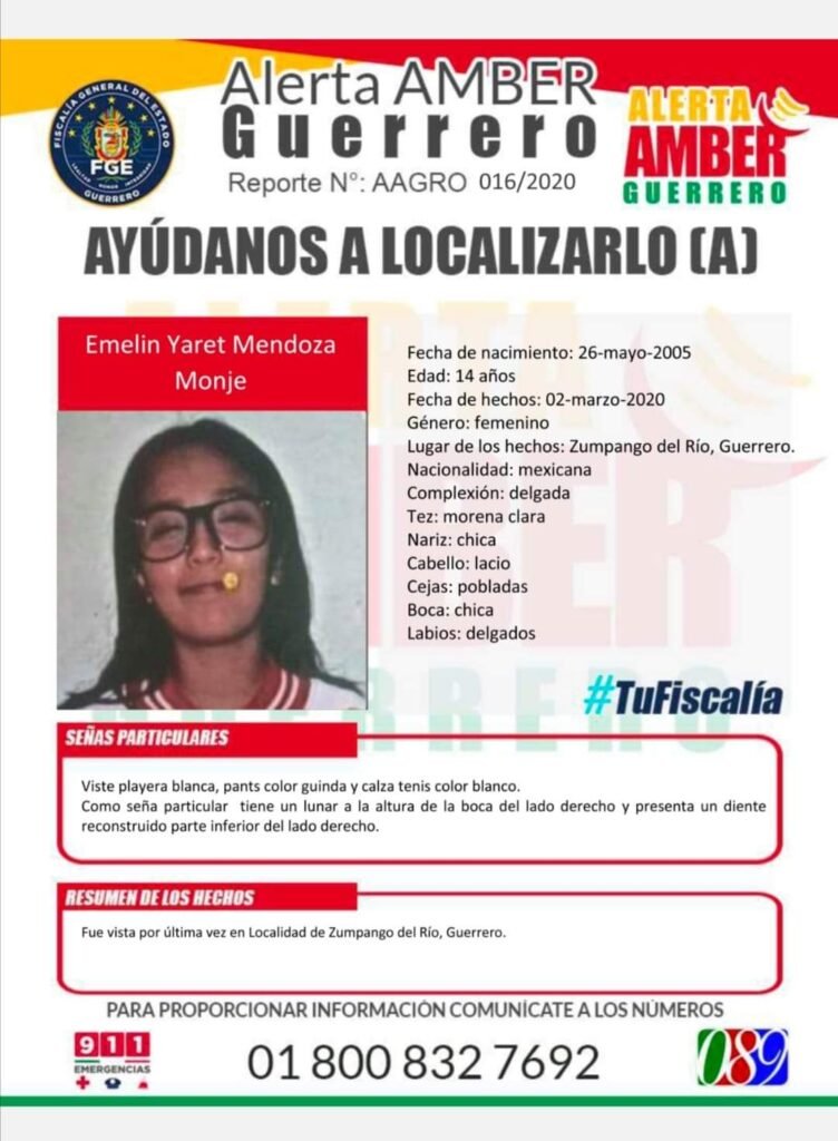 La menor Emelin Yanet “N” desapareció el lunes en Zumpango del Río, cabecera municipal de Eduardo Neri informó la Fiscalía General del Estado (FGE).