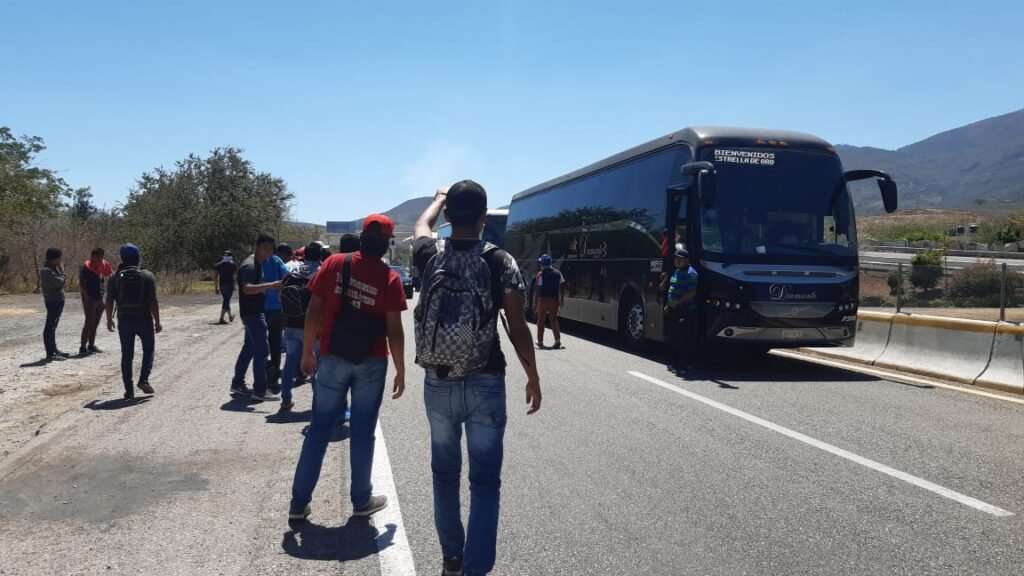 Alrededor de las 13:00 horas, unos 50 jóvenes que llevaban sus rostros cubiertos arribaron al punto conocido como El Parador del Marqués, donde redujeron la circulación a un carril por cada sentido para detener los autobuses y obligaron a los pasajeros a que se bajaran en el lugar, con todo y equipaje.