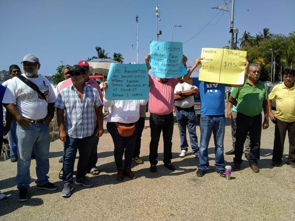 Transportistas de autobuses urbanos del Bloque Uno de la Ruta Costera Miguel Alemán de Acapulco protestan en el Asta Bandera, para exigir apoyo económico a los tres niveles de gobierno.