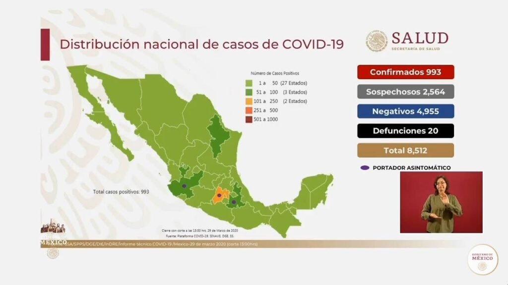 La Secretaría de Salud (SS) informó la tarde de este domingo que el número de personas muertas por Coronavirus Covid 19 llegó a 20 y los casos confirmados de coronavirus a los 993, 4 decesos más que los reportados el sábado y un aumento de 145 en 24 horas.