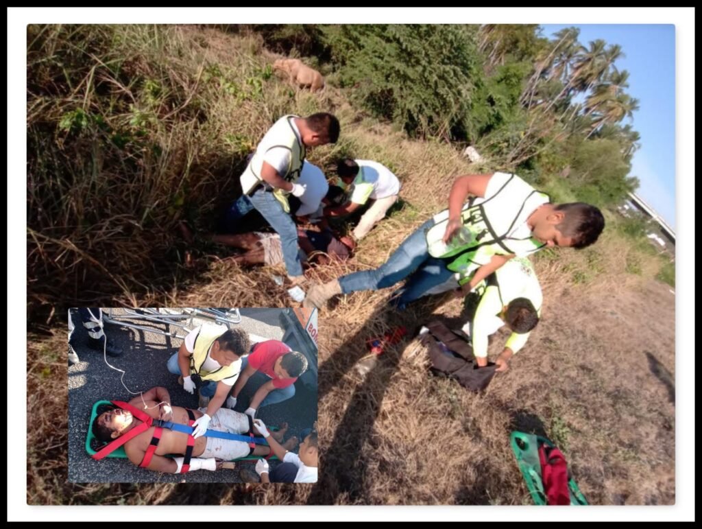 Al lugar del percance acudieron paramédicos de la Cruz Roja y de Protección Civil, quienes atendieron a un hombre con múltiples golpes en diferentes partes del cuerpo, quien estaba a orilla de la cinta asfáltica, sobre el pastizal, quien conducía una motocicleta marca Itálica 250, color gris con negro, la cual volcó.