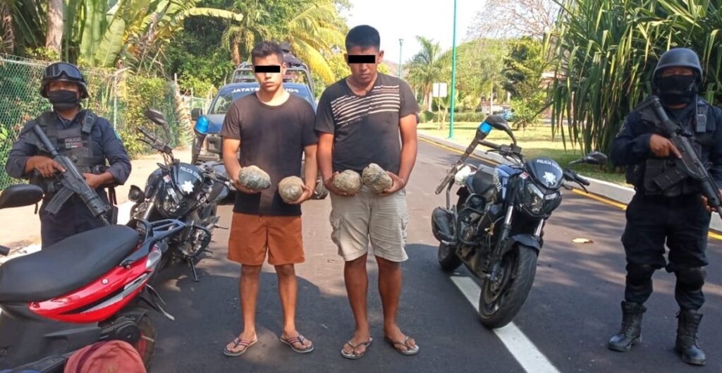Los oficiales de la SSP Guerrero que realizaban patrullajes en unidades motopatrulla para la prevención de delitos en la zona turística de Ixtapa, cuando circulaban en la avenida Paseo de los Viveros aseguraron a Marc Antony “N” de 21 años, quien traía una mochila en la que se localizaron dos envolturas con cinta canela que contenían hierba seca color verde con características propias de la marihuana, y Luis Alfredo “N” de 20 años, mismo que en una mochila traía dos envolturas con cinta canela que también contenían probable marihuana.