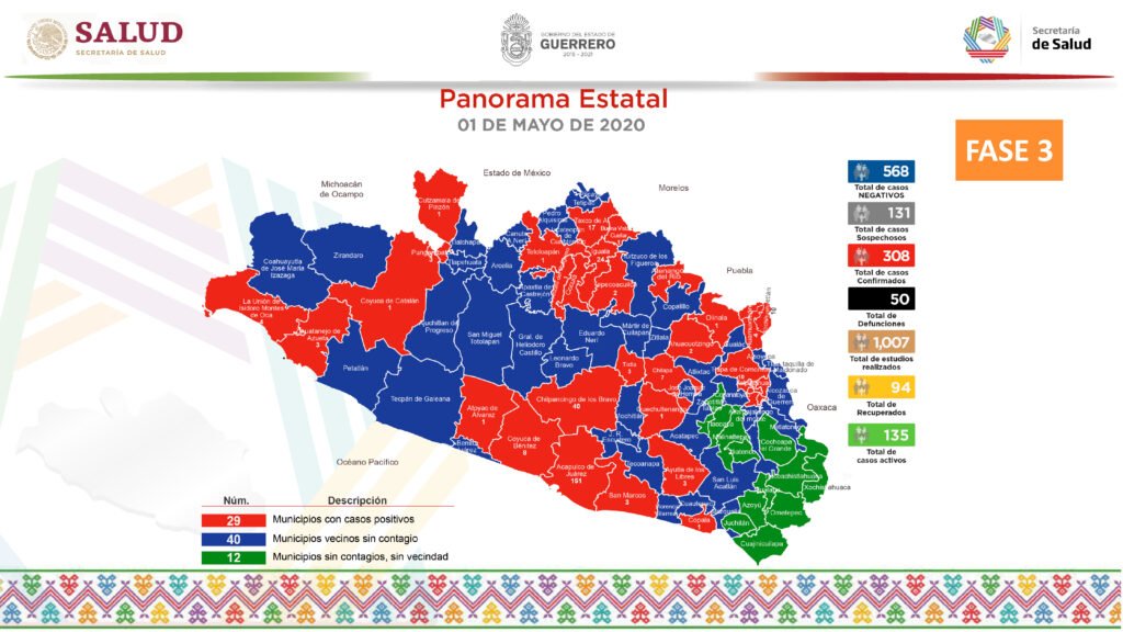 Del 27 de abril al 1 de mayo, cuatro nuevos municipios reportaron casos positivos, entre ellos Olinalá, Pungarabato, Teloloapan y Coyuca de Catalán, la mayoría con un caso.