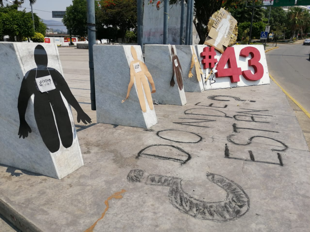 En el anti monumento a los 43 estudiantes desaparecidos de Ayotzinapa, sobre el suelo pintaron con spray “¿dónde están?”, y sobre 4 pilares que sostienen astas pegaron 4 siluetas de personas con la misma pregunta y que es la consigna de esta movilización #CorazonesEnMarcha, #HastaEncontrarles, #MujeresEnLaBúsqueda.
