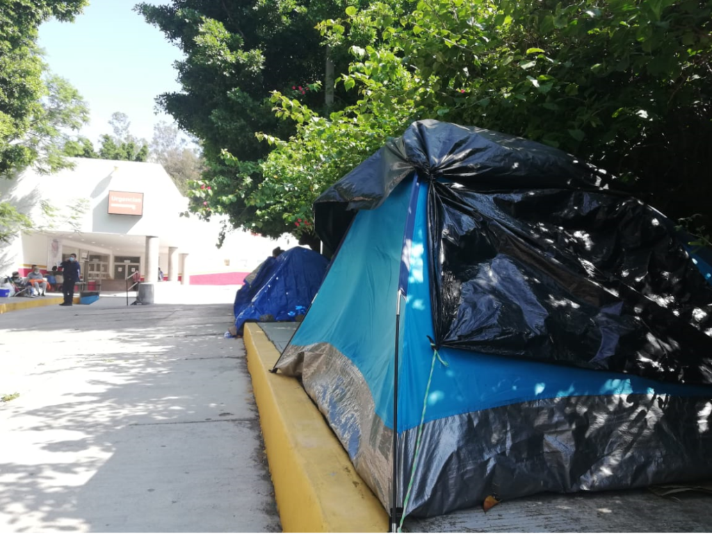 Familiares de pacientes internados en la clínica del ISSSTE de Chilpancingo, algunos de ellos con Coronavirus (COVID-19), instalaron casas de campaña en ese nosocomio, en donde pasan la noche, mientras esperan que los médicos les informen la situación de salud de sus enfermos.