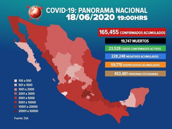La Secretaría de Salud informó este jueves que los casos confirmados ascendieron a 165 mil 455, de los cuales 23 mil 528 son activos —mil 319 más que el miércoles—, es decir que presentaron síntomas del virus en los últimos 14 días, informó José Luis Alomía, director general de Epidemiología.