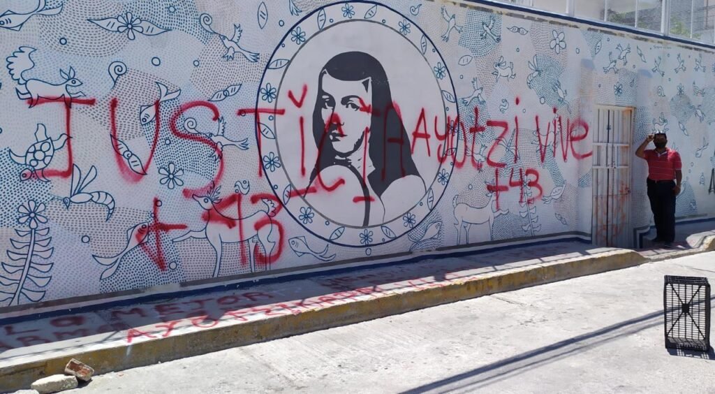 Los normalistas también realizaron pintas, como en otras ocasiones, a pesar de que en la fachada hay un mural, donde dejaron su exigencia de justicia por los caídos y los desaparecidos.